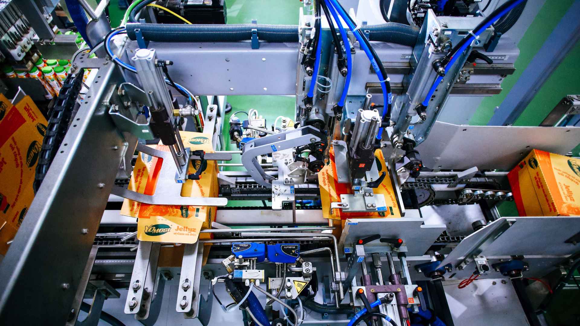 FrieslandCampina Thailand opted for a wrap-around case packer machine, together with a bottle line divider at packer infeed – flexible enough to divide the flow from one lane up to eight lanes, depending on the bottle format – and conveyors connecting the solution to the production line, both upstream and downstream. This configuration ensured an impressive speed of more than 500+ shaped bottles per minute, equal to 24 cases per minute.