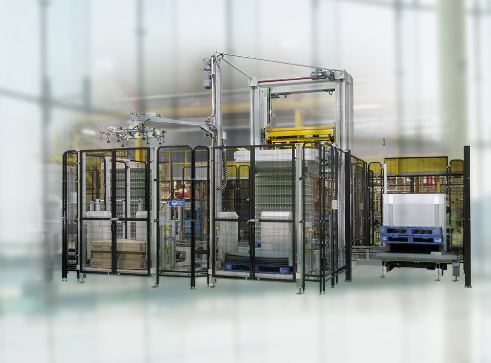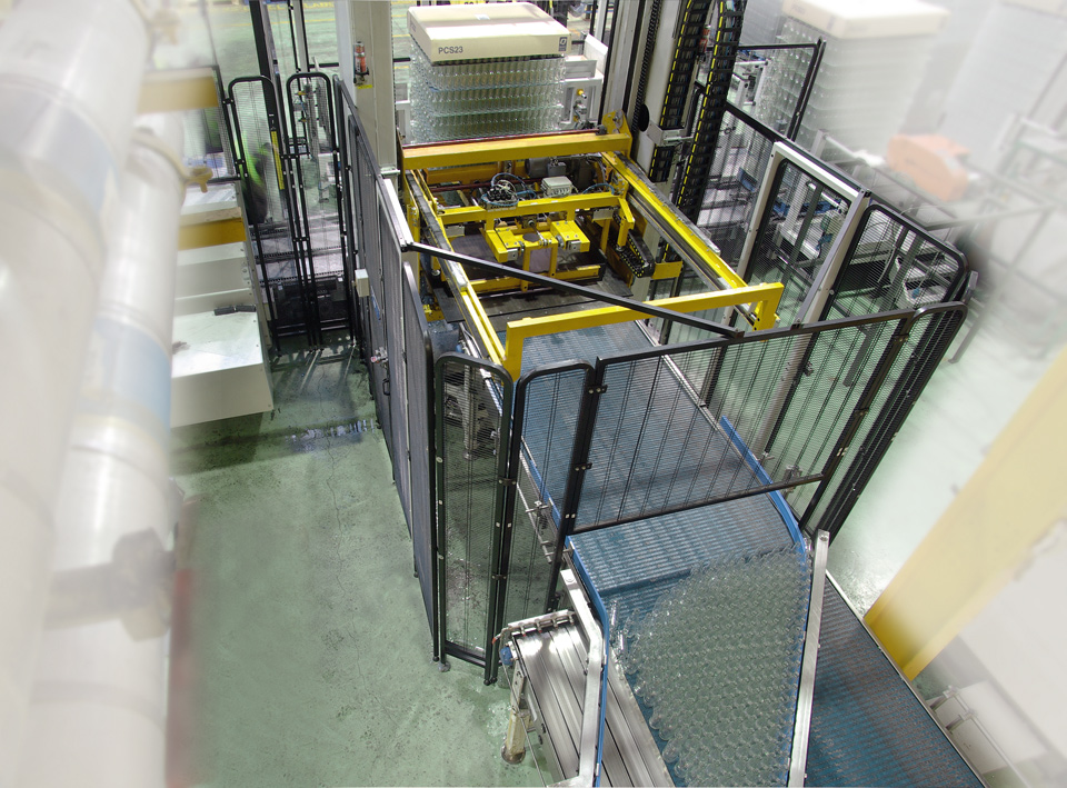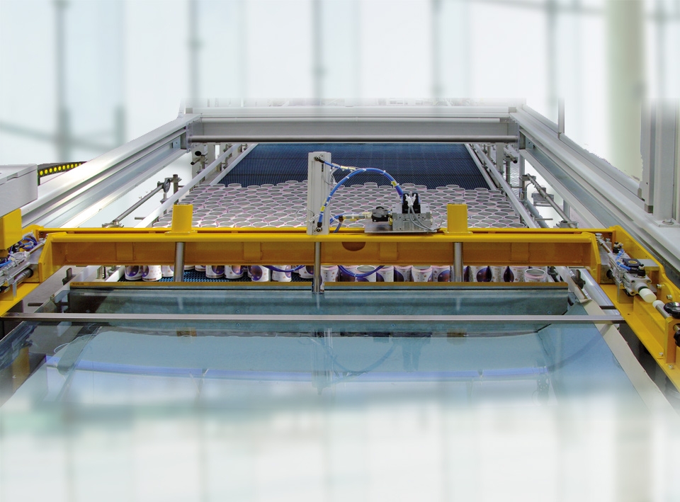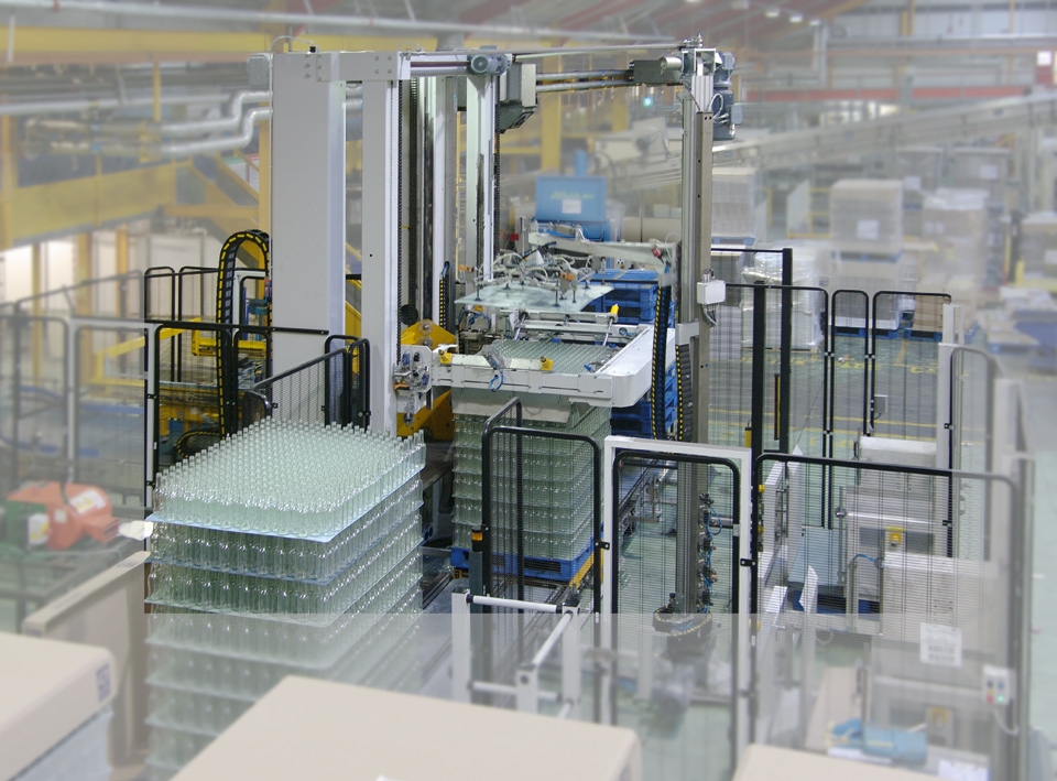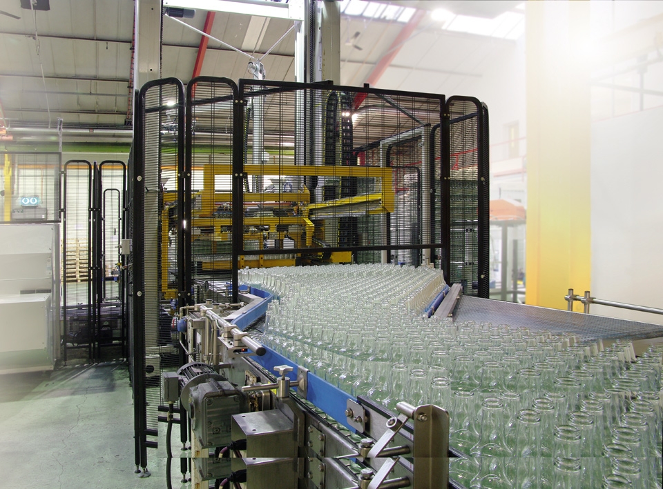 Sweepoff B works at medium speeds, reaching up to three layers per minute. Particularly well-suited for glass bottling lines, this depalletizer can also handle PET bottles and offers easy access.
