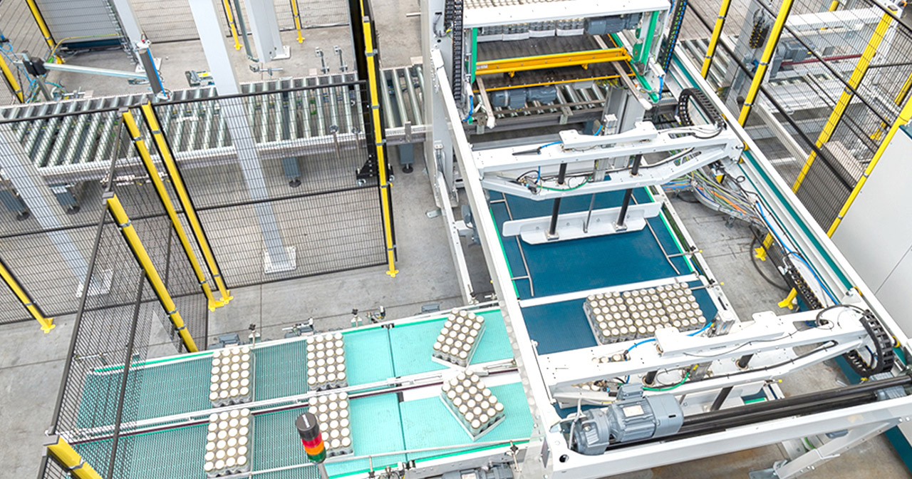 PalKombi is an automatic palletizer suitable for crates, cartons, trays, shrink-wrapped packs and all types of packages in general. Designed for medium to high speeds, PalKombi works with a steady low-level infeed pallet. The maximum speed is 5 layers/minute for the one-pallet version and 8 layers/minute for the version with two pallets worked simultaneously. The preformed layer lifting system is supported by two vertical columns with U-shaped closed bars. Wearproof steel guides ensure the roller bearings roll efficiently. With a simple design and standard parts, PalKombi benefits from a precise mechanical assembly and high-quality components. It affords easy control and access and is fully safeguarded against accidents.
