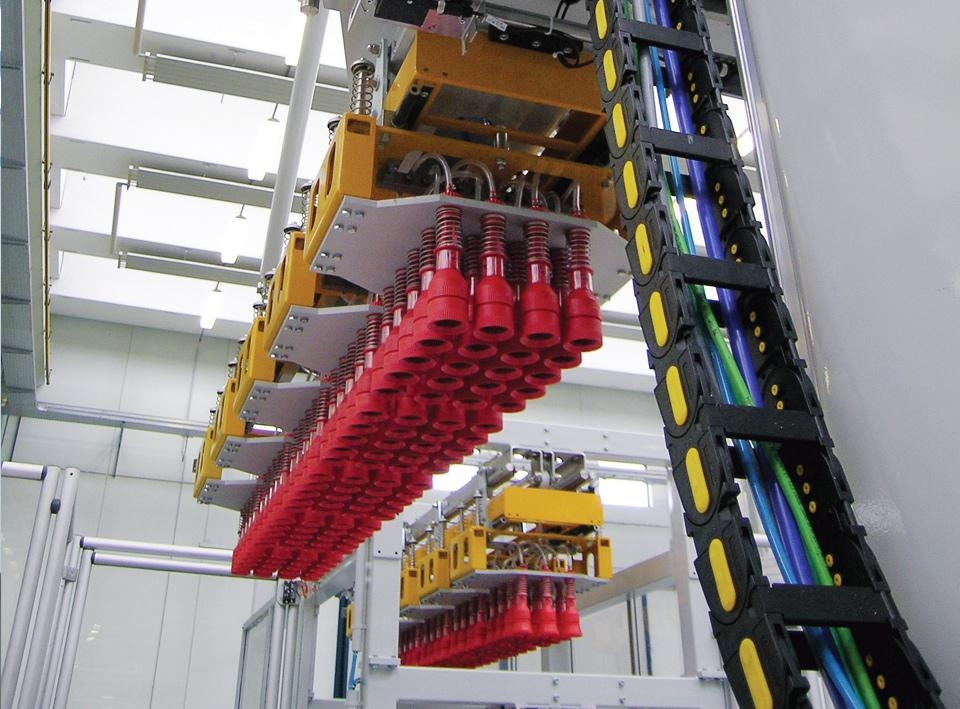 The movements are driven by electromechanical drive units electronically controlled by the PLC. When required, the individual movements can be controlled and operated independently by selecting “manual” mode on the operator panel. When several formats of bottles/crates are to be handled, the machine can be equipped with a rack to house the various sets of gripping heads.
