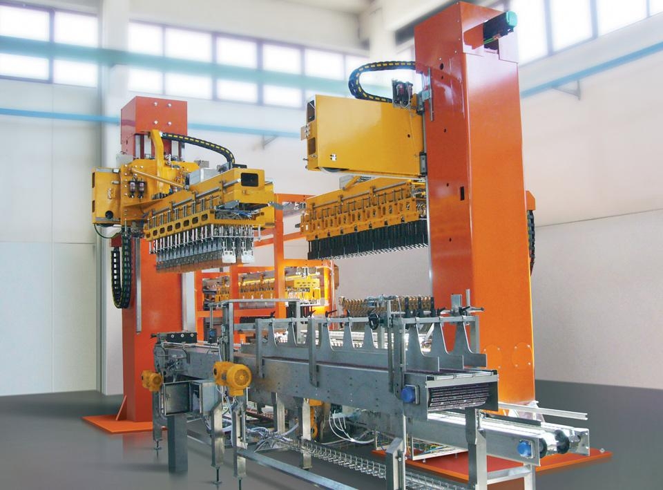 The movements are driven by electromechanical drive units electronically controlled by the PLC. When required, the individual movements can be controlled and operated independently by selecting “manual” mode on the operator panel. When several formats of bottles/crates are to be handled, the machine can be equipped with a rack to house the various sets of gripping heads.
