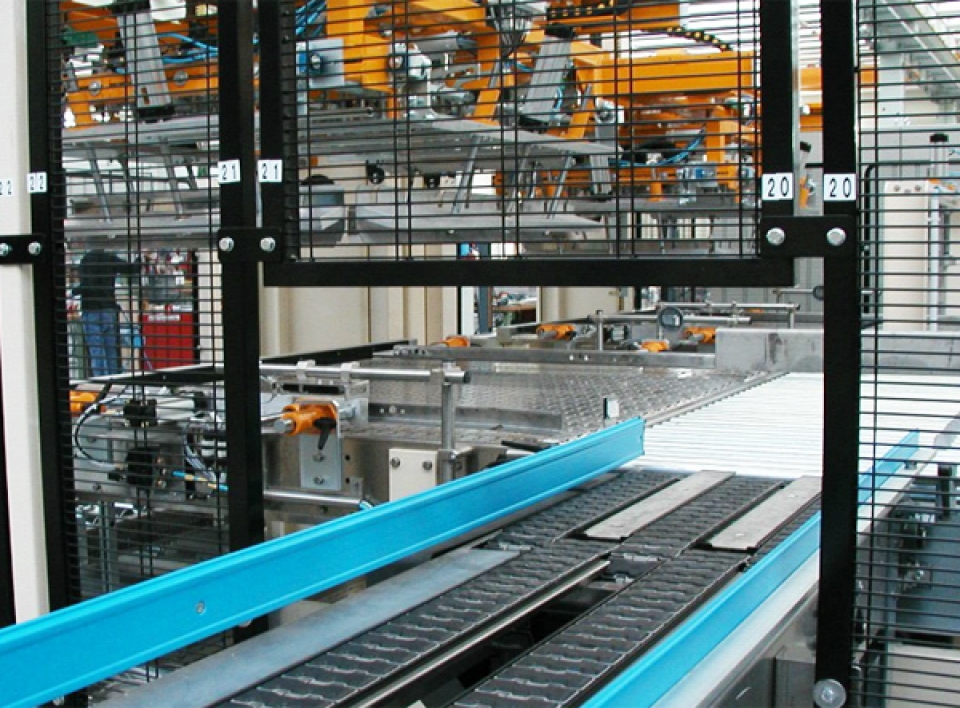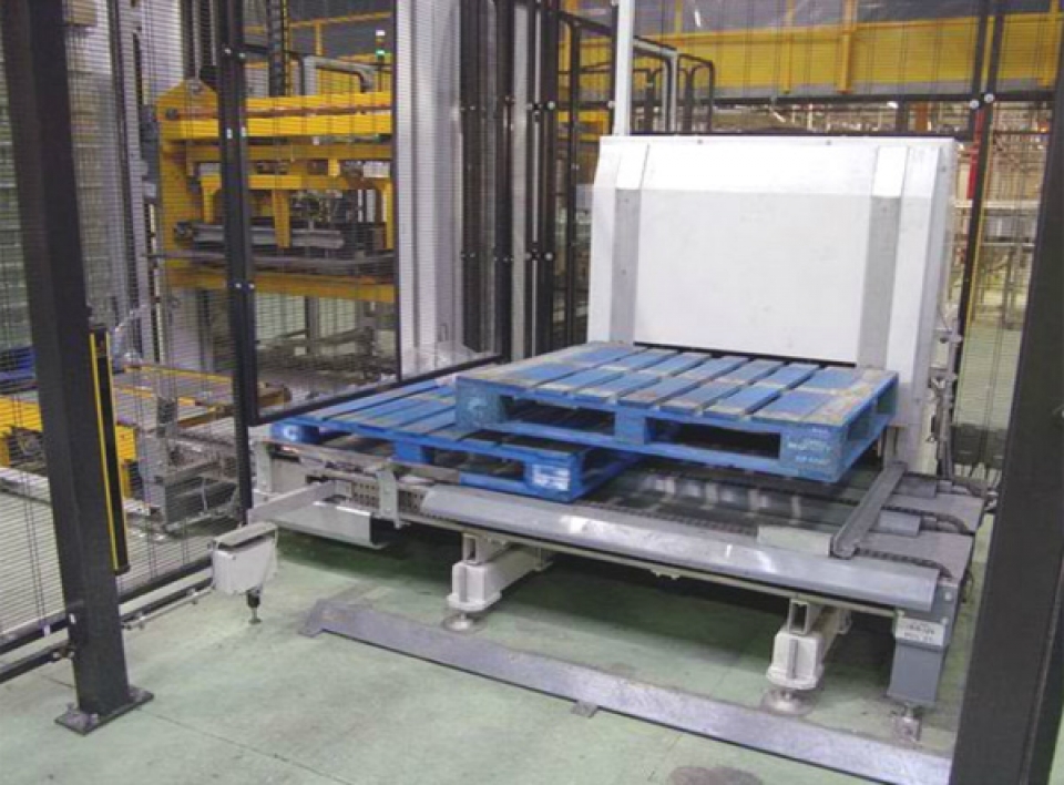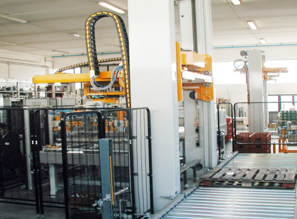 Lifting : Central lifting composed by two columns and a servo-driven trolley. A counterweight system allows smooth handling of a layer. The layer is taken away from the pick-p table and released on the pallet. Safe operation due to pneumatic parachutes that prevent any risks of layer falling in case of power failure.