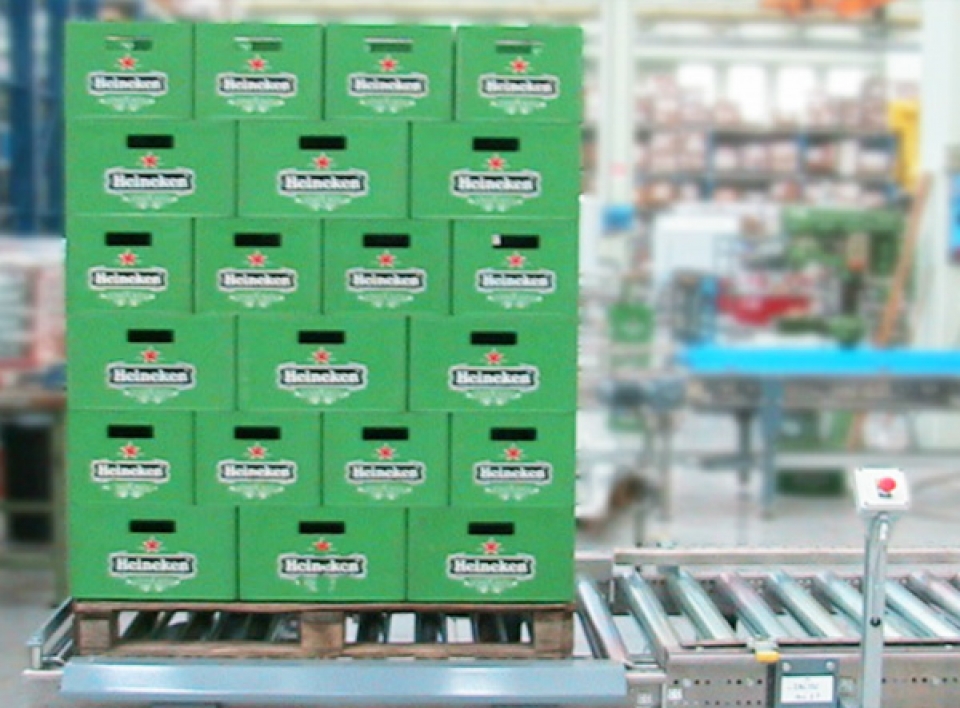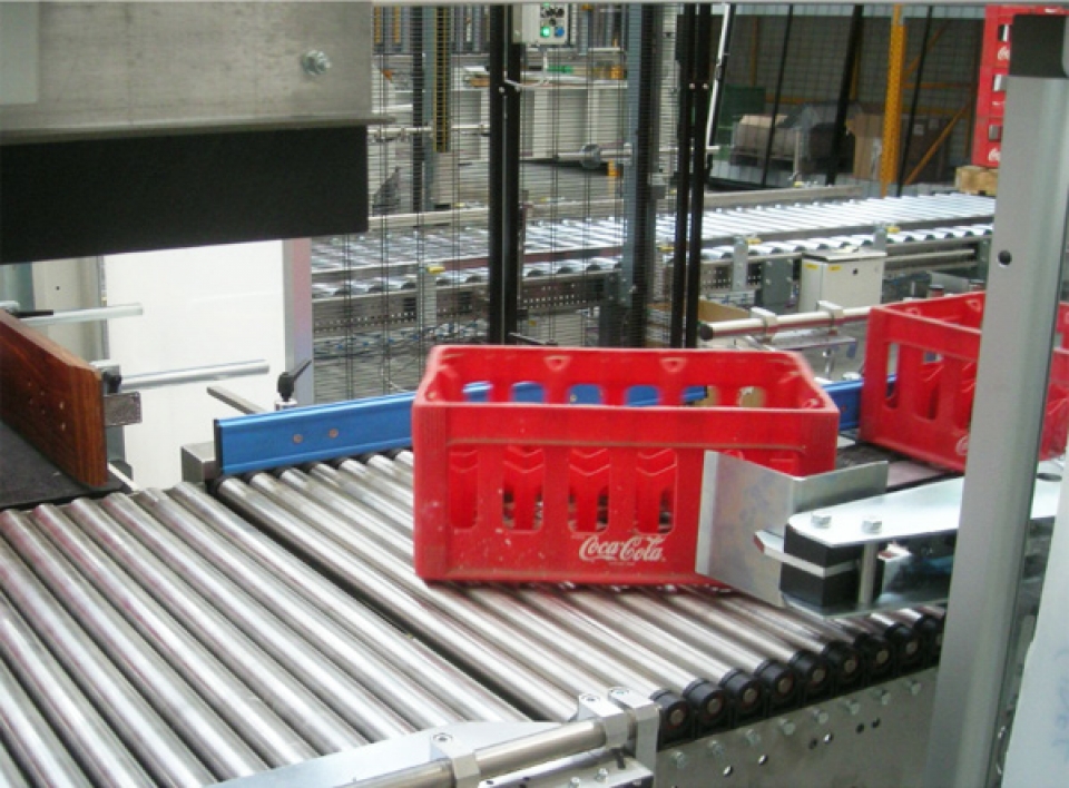 The crates arrive from a single or double lane divider dispensing them into different lanes. Plastic plates are installed on the rollers in order to correctly convey crates according to predefined patterns. The divider is equipped with inverter control speed adjustment for different formats.