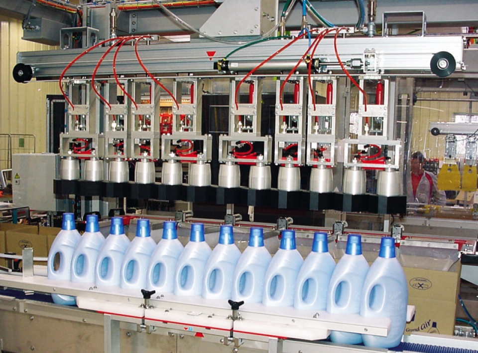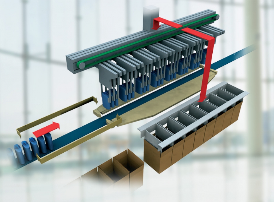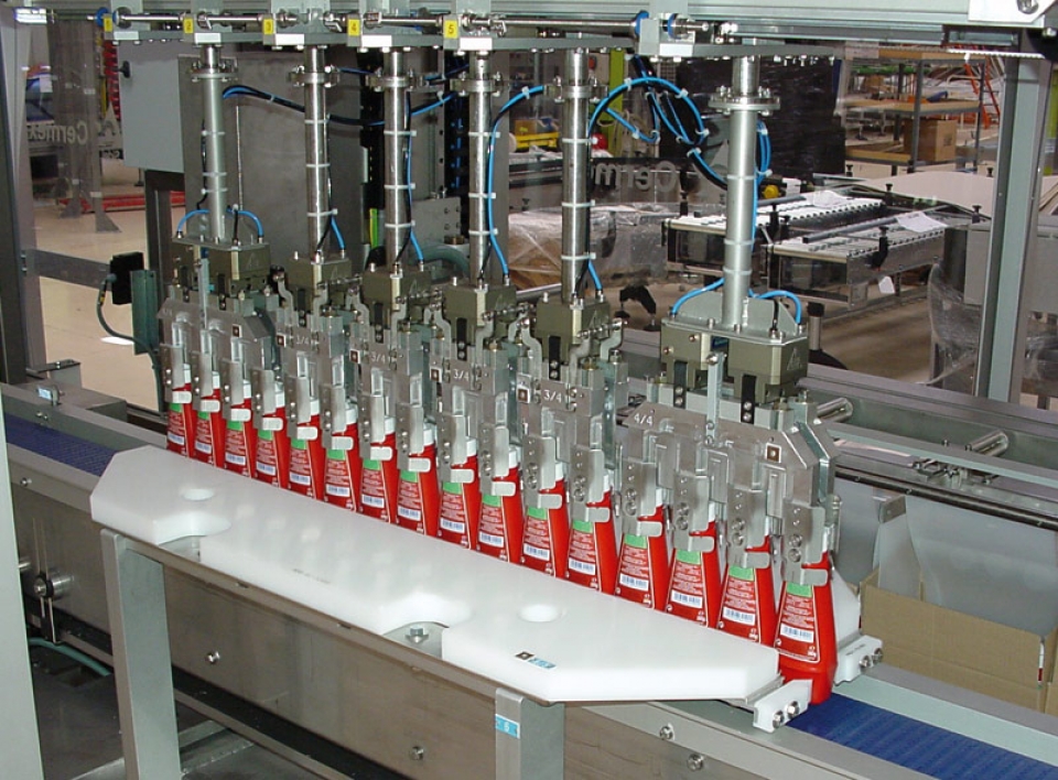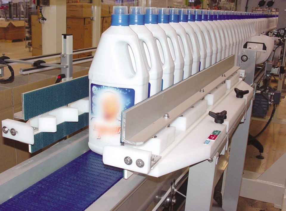 The high-speed bottle infeed is a handling & positioning module for continuous product infeed on a single lane (with bottles turned where necessary) where the product batch is transferred to the gripping station in a continuous motion.