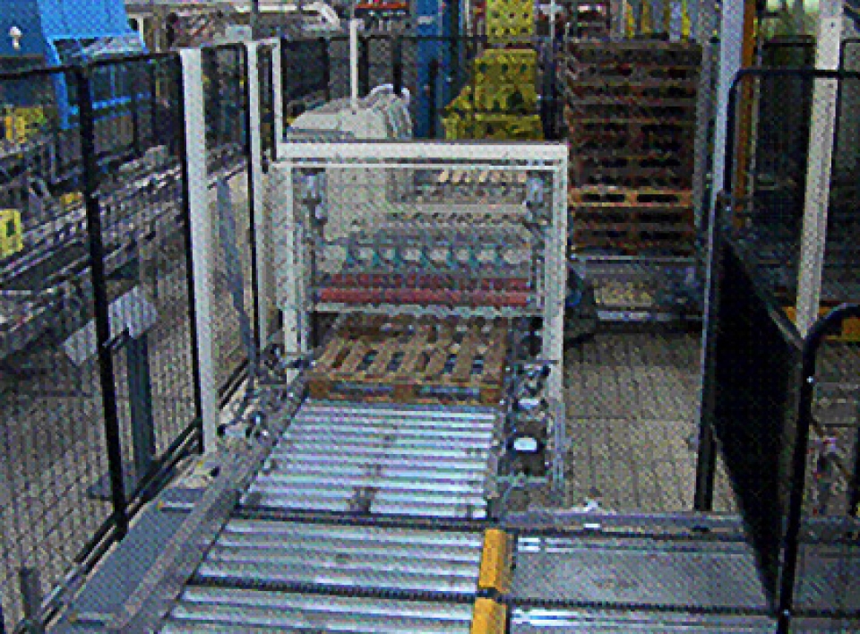 Sidel’s pallet inspection system provides automatic control of wood integrity - on both sides of the pallet. It does so by means of idle metallic feeler-pin rollers installed on elastic elements. These feeler-pin rollers roll smoothly along each wooden plank of the pallet as it advances. When it finds a broken plank, the brusque movement of the roller (and its elastic element) away from its normal condition is revealed by a photocell, which sends a signal to activate the automatic pallet ejection system.