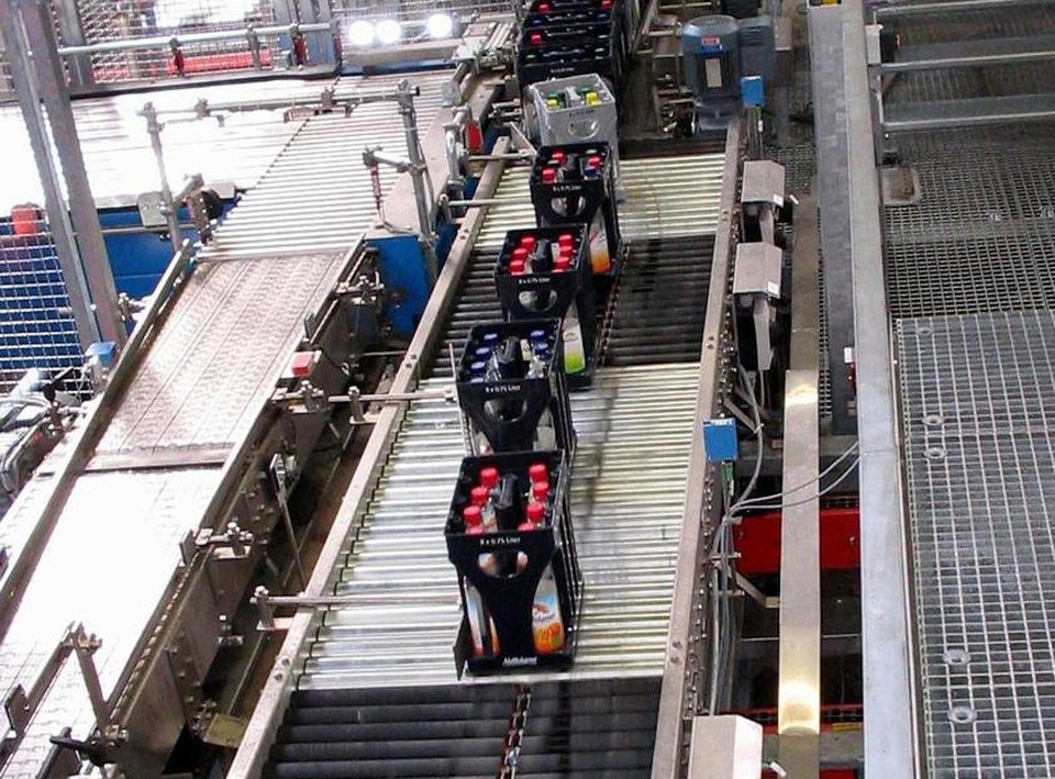 The principle behind the Sidel crate turner is that each lane has its own variable speed drive which allows the operator either to turn the crate or to maintain it as it is.